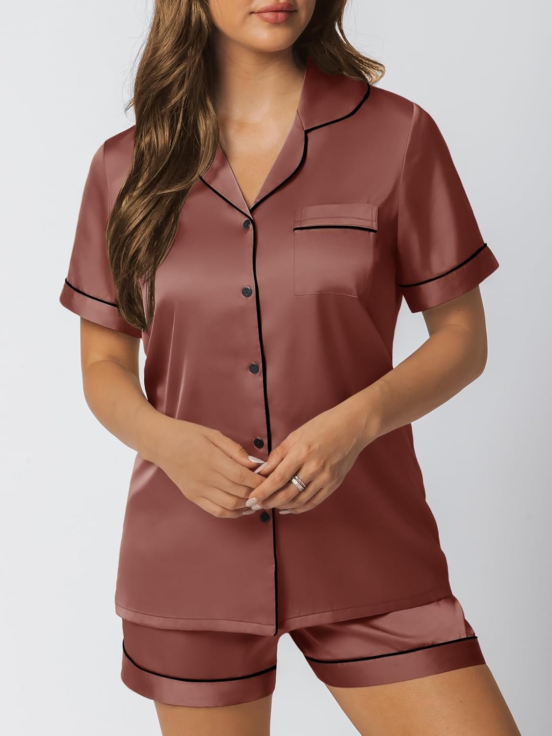 Features: The relaxed fit two-piece comfortable sleepwear pajama set features silky shorts with elastic waistband and matches a silky-smooth short-sleeve V-neck top with a chest pocket, notch collar and the button-front top hits at hips. The sleepwear set are soft and elegant, to giving you a lazy sleep.